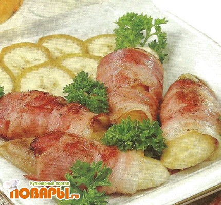 Бекон нарежьте тонкими полосками. Заверните кусочки бананов в ломтики бекона, скрепите деревянными шпильками и обжарьте до образования хрустящей корочки. Подавайте горячими.