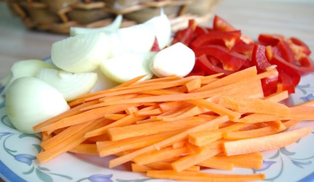 И дальше в том же масле обжарила по очереди - морковь, лук и паприку. Вкуснее будет, если они останутся чуть хрустящими.