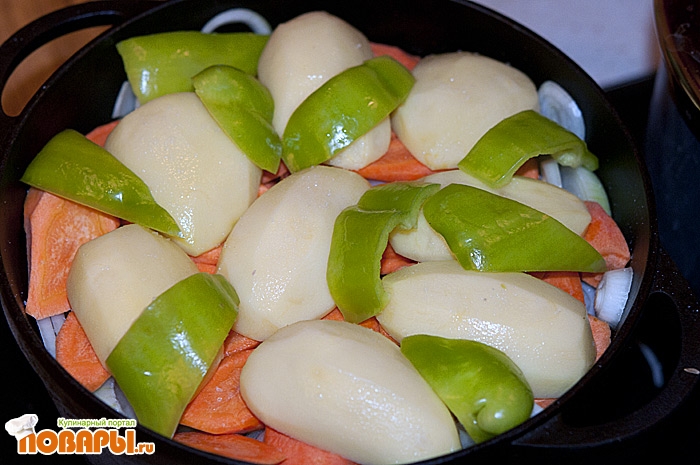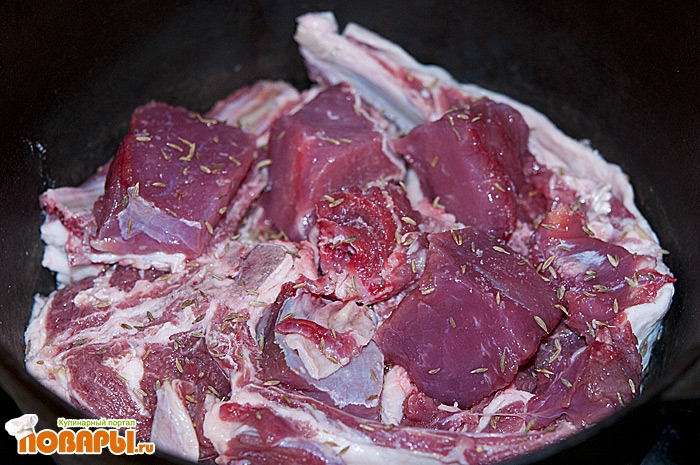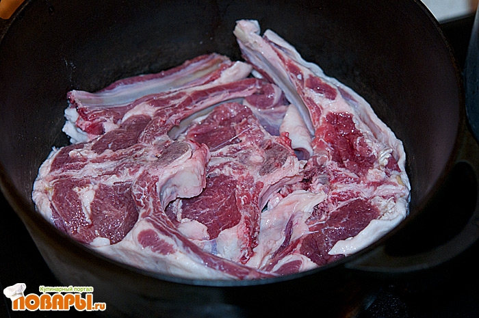 Второй слой - это наше мясо, в моем случае это баранина и говядина. Выкладываем мясо жиром вниз.
