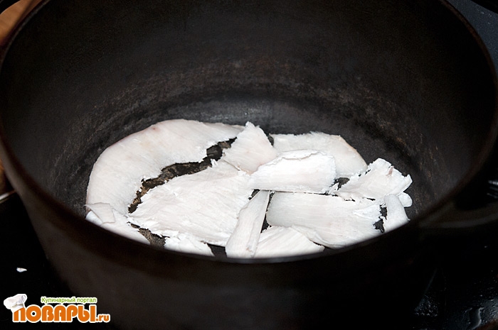 Выкладываем в холодный казан наш первый слой - это курдюк нарезанный тонкими ломтиками, если у вас его нет, ничего страшного, можно попробовать использовать свиное сало.
