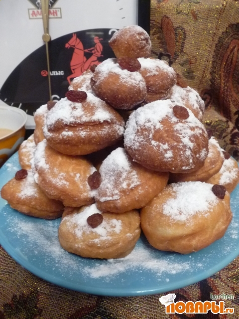 Выкладываем на блюдо, посыпаем сахарной пудрой, украшаем изюмом и наливаем чаю. Без чая не как! Как говорят казахи: "Шай не пьешь - голова болит!"