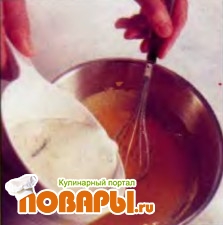Размешайте венчиком желтки с сахаром: нет необходимости взбивать их, достаточно только хорошо перемешать ингредиенты.