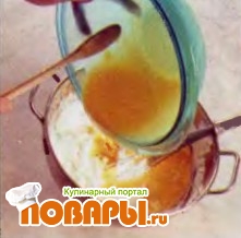 Перелейте полученную массу в кастрюльку, поставьте на очень медленный огонь и введите размягченный и отжатый желатин. Варите на огне, пока желатин не растворится.