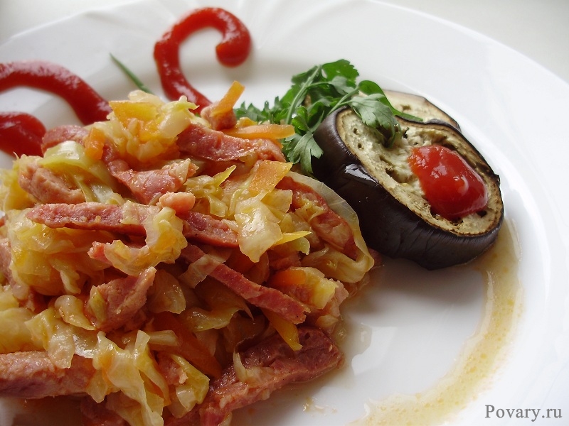 Добыв из печного отверстья печеный, к тому соленый да маслом добреный чудной баклажан, кладем его горкой на круглу тарелку, добавив какого зелёна листа. По капле томатов вкуснейшей приправы, что кетчупом кличут, мы сверху польем, да сразу поблизости мы расположим тушеного яства с капустой, с мясцом.
