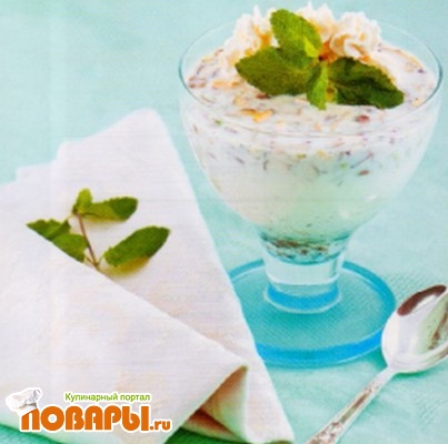 Разлить смесь по креманкам. Охладить. При подаче украсить взбитыми сливками и листочками мяты.