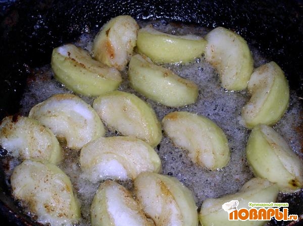 Яблоки разрезать на 8 частей, удалить серединку и обжарить на смеси подсолнечного и сливочного масла примерно 3-5мин, посыпать сахаром, корицей и еще минутку потомить.