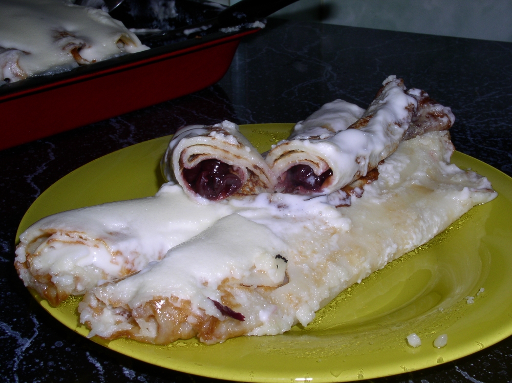 Смешать ингредиенты для блинов и пожарить блинчики. Посредине каждого блина выложить в рядок вишни и свернуть трубочкой.