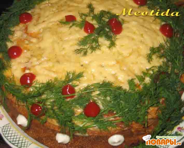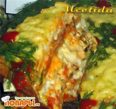 кладем еще три блинчика, промазывая их маслом, верхний блин обильно смазываем оставшимся соусом и отправляем всю эту вкусноту в разогретую до 200С духовку минут на 30, затем посыпаем сыром и возвращаем еще минут на 10 в духовку
