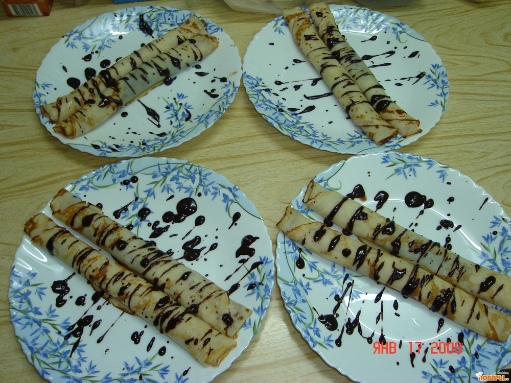 Готовые блины в середине смазать шоколадом, свернуть трубочкой и полить красиво шоколадом.