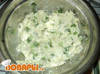 Для второй начинки измельчаем яйца, добавляем рис и мелко порезанный зеленый лук. Солим, перчим.