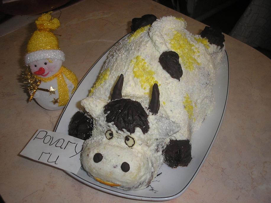 Из большего торта острым ножом начинаем вырезать тело будущей коровы. Затем из меньшего вырезаем голову. из небольших обрезков впереди тела выкладываем небольшую шею, и потом с помошью конфитюра прикрепляем готову. Из оставшихся коржей вырезаем ушки, рожки и делаем передние копытца (задние вырезаются сразу на теле).