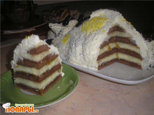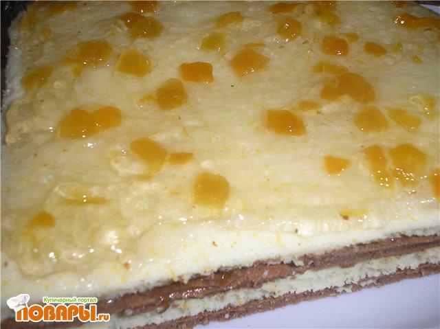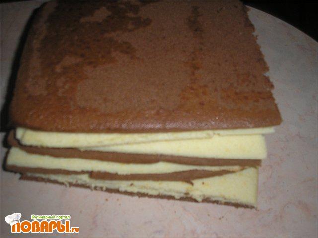 Достаём с духовки и разрезаем на 4 части. получается 4 белых коржа и 4 коричневых. 1 белый и один коричневый отлаживаем в сторону. Из остальных собираем торт. Положим по очереди коржи, каждый пропитываем сиропом и смазываем конфитюром. Ставим пропитываться.