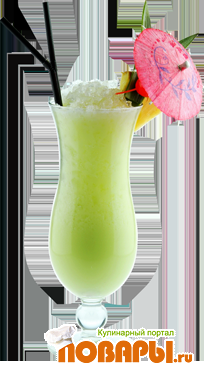 Налей банановый сироп 10 мл, сироп маракуя 10 мл, дынный ликер 20 мл, водку 60 мл и выжми половинку лайма