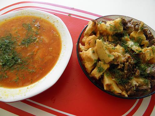 После окончания варки, галушку и куски мяса вынимаем из борща, нарезаем все небольшими кусочками.