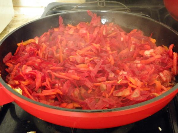 На крупной терке натираем морковь и свеклу, лук нарезаем кубиками и все протушиваем на растительном масле, примерно 10-15 минут. В конце добавляем томатную пасту.