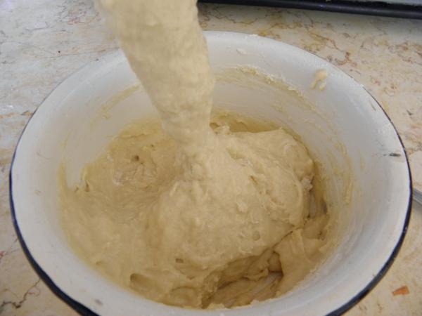 В мисочку разбиваем яйцо, слегка разбалтываем его, солим, добавляем молоко, еще раз взбиваем и добавляем муку, тщательно размешиваем. Тесто должно получится густым и как бы "сползать" с ложки. Все!