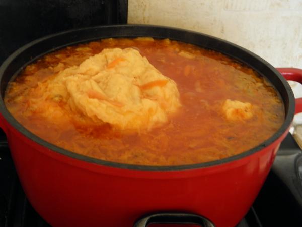 Выкладываем тесто прямо в кипящий борщ и накрываем крышкой. Такая большая галушка варится примерно 20 минут.
