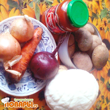 Пока варится на слабом огне картофель - делаем заправку к борщу. Для этого нарезать соломкой морковь, свеклу и лук. Пассеровать до готового состояния после чего добовить томатную пасту и тушить 15 минут.