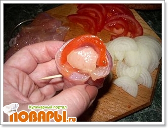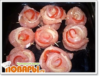 Делаем розочку из филе. Вырезаем небольшой брусочек из филе - это будет серединка. На пластину филе кладем пластину помидора и оборачиваем вокруг серединки, закрепляем зубочисткой. Берем еще пласт филе, на него кладем пластинку лука, оборачиваем вокруг нашего бутончика.