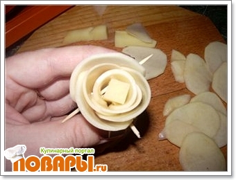 В это время делаем картофельные розочки. также заготавливаем брусочек - серединку. Тонко режем картофель. По той же технологии, что и мясные розочки делаем несколько картофельных. Обжариваем в кипящем масле.