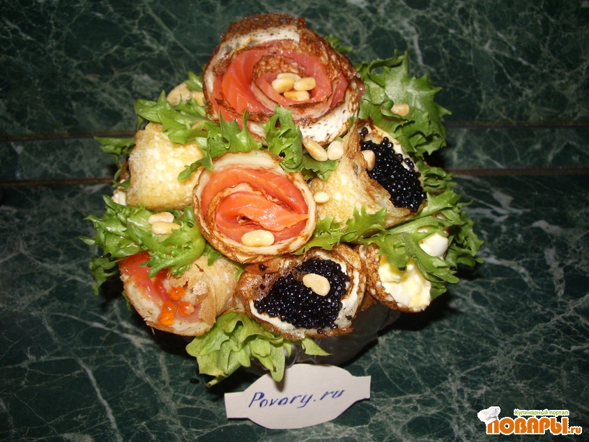Каждый блин разрезаем на 2 половинки, каждую сворачиваем кулечком, выкладываем начинку. Начинка из яиц: яйца режем, чуть солим и добавляем майонез. Все остальные виды начинок в чистом виде :) Рыбку предварительно режем полосками.