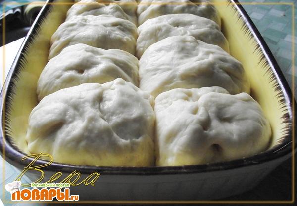 Края теста защипнуть, уложить булочки в смазанную форму, швом вниз.