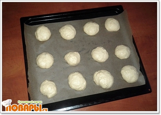 Когда тесто подойдет слегка перемесить его, разделить на 15 равных частей и сформировать кругленькие булочки, выложить на протвень укрытой бумагой для выпечки. Дать им подняться 30-40 минут. Затем смазываем их взбитым яйцом. Выпекать в разогретой до 210-220 градусов духовке 10 минут.