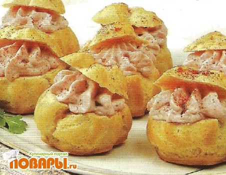 Для теста вскипятите воду с солью и маслом. Смешайте муку с крахмалом и всыпьте при помешивании в кипящую жидкость, проварите около 2 минут, пока тесто не начнет отставать от стенок. Тесто слегка охладите и, взбивая, введите яйца. Затем добавьте сыр и размешайте.