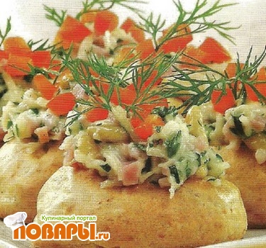 Для начинки смешайте сыр, майонез, мелко нарезанную ветчину, орехи, приправу и зелень.