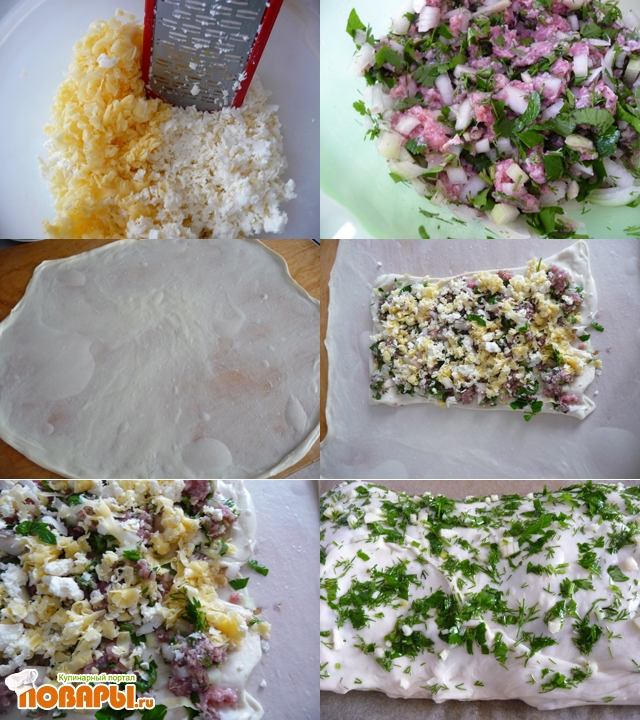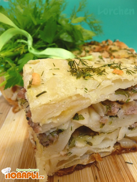Это кладем на растянутую третью лепешку и повторяем так же: фарш - начинка - складываем конвертом и т.д. Смазываем пирог растительным маслом, в которое добавить мелко порезанные чеснок и зелень.