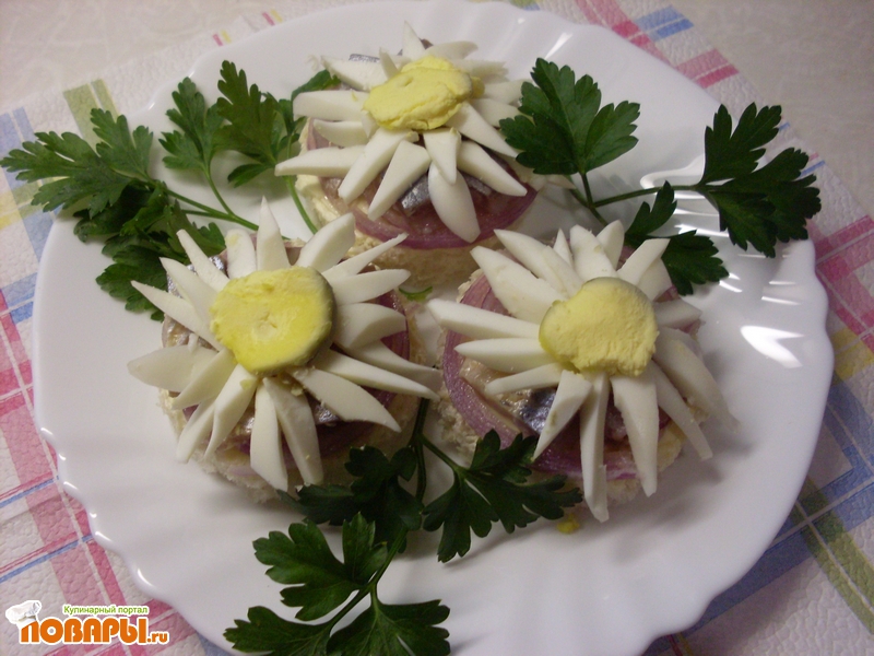 Ломтики хлеба смазать маслом, сверху уложить маринованный лук и ломтики селедки, украсить ромашкой из вареного яйца.