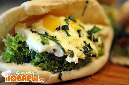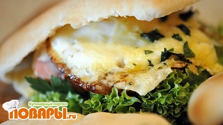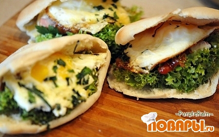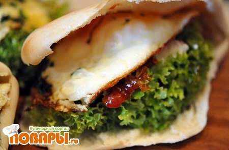 В поделенный на две части хлеб положить салат. Заправить помидором, беконом, кетчуп, майонез, горчицу - по желанию. Так же положить в наш бутерброд яичко, посыпать сыром.