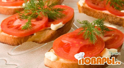Нарезать помидор кольцами и украсить каждый бутерброд. Всё готово. )