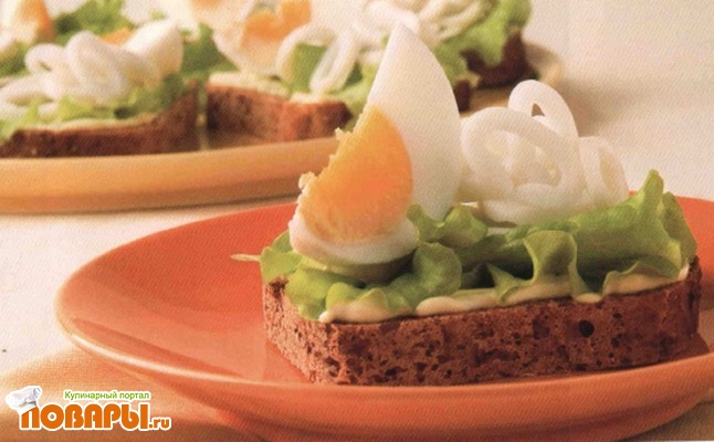Ломтики хлеба смажьте майонезом, положите по половинке листа салата, затем - нарезанных кальмаров и по дольке яйца.