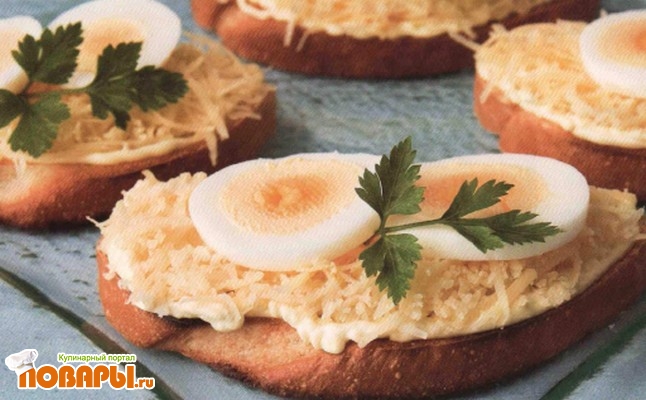 Сыр натрите на терке. На ломтики батона разложите тертый сыр, затем - яйца, нарезанные кружочками. Оформите листиками петрушки.