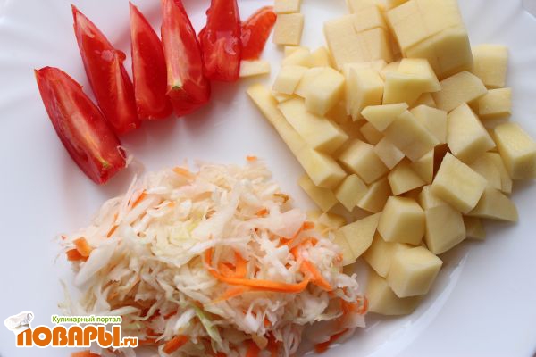 Поджаренный лук заливаем водой, добавляем картофель, помидоры и капусту. Солим, перчим. Закрываем крышкой и варим до готовности картофеля.