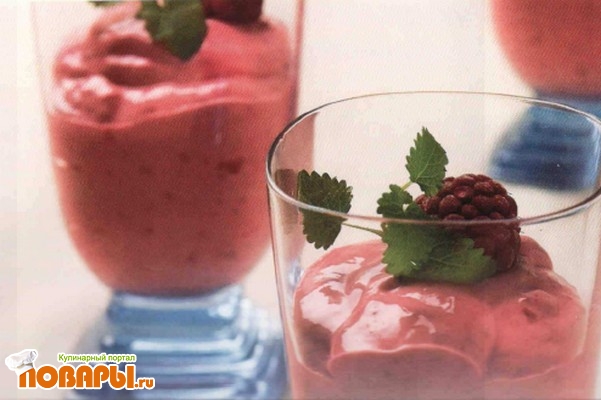 Добавьте малину, мешайте смесь до тех пор, пока ягоды не начнут мяться и смесь не станет розовой.