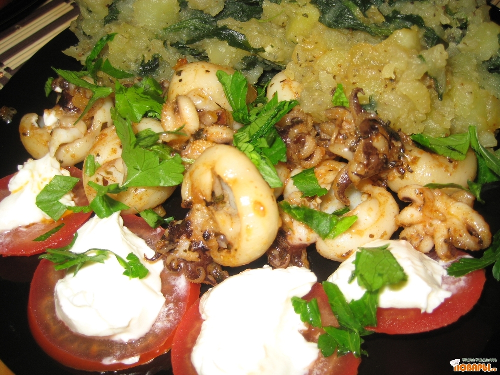 Проверить, что всё достаточно посолено и выложить на тарелку!) есть блюдо горячим, хрустящие чесночные щупальца каракатиц и пряная горячая картошка идеально сочетаются с холодной и нежной закуской из помидоров и сыра))) Бон аппети! :