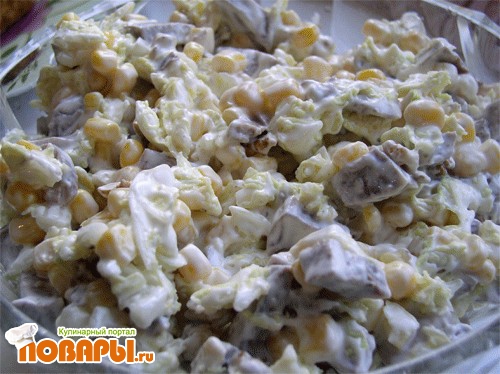 Капусту нашинковать, язык порезать соломкой, добавить кукурузку, орехи, порезанный лучок (по желанию), заправить майонезом, и перемешать.