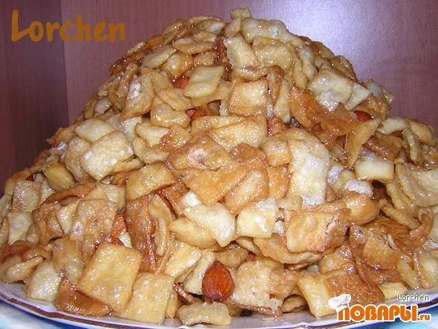 Влить в сироп в жареный чак-чак, добавить орехи и хорошо пермешать.