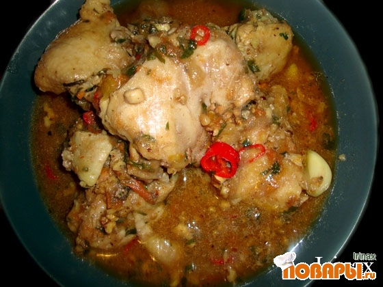Обжарить все это дело, не добавляя воды.Курица сама даст сок.