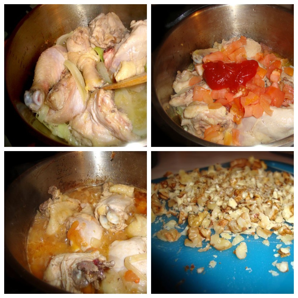 Помидоры очистить от кожицы (залить кипятком на несколько минут, кожа с помидора легко снимется), нарезать кубиками. Добавить помидоры и томатную пасту к курице.