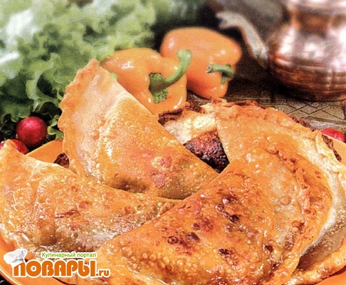 На половину каждого круга положить фарш, накрыть другой половиной, соединить.