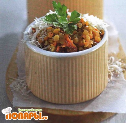 Попробуйте чечевицу - если она не готова, подлейте немного воды и готовьте еще 7-10 мин. Добавьте листики петрушки, перец и соль, перемешайте. Разложите по тарелкам и, по желанию, посыпьте пармезаном.