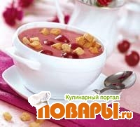 Хлеб смазать оставшимся маслом, подрумянить в сковороде и разрезать на маленькие крутоны, разложить их по глубоким тарелкам и залить черешневым супом.