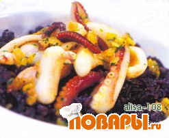 Налить в сотейник 4 ст. л. оливкового масла и поджарить мелко нарезанный лук. Вынуть из маринада морепродукты и слегка обжарить. Добавить маринад и вино. Открыть чернильный мешок и вылить чернила в сотейник, тушить 20 мин, подливая бульон.