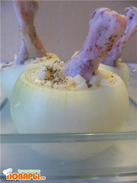 В лук поставить голень и насыпать начинку.