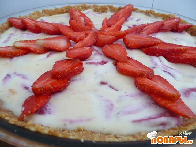 Разровнять, украсить клубникой и поставить в холодильник на 4 часа для застывания.
