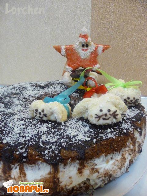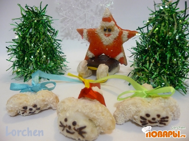 Белым шоколадом раскрасить при помощи кисточки Кроликов, посыпав кокосовой стружкой ушки, и полозья саней. А молочным шоколадом - дощечку для саней и нарисовать мордочки Кроликам. Когда шоколад застынет, при помощи шоколада соединить полозья и дощечку.