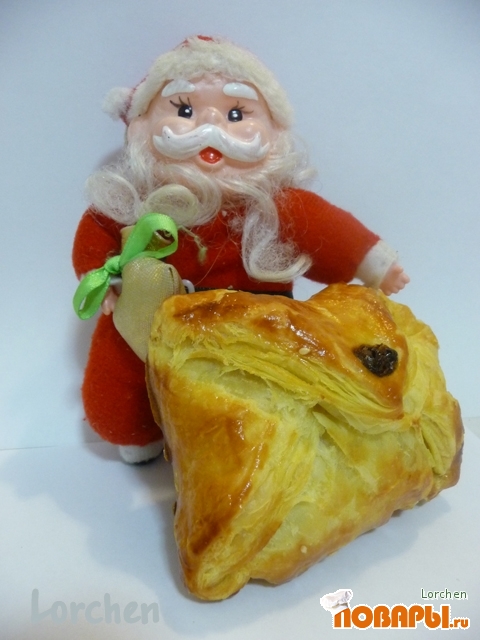 Разморозить тесто, немного раскатать. Положить начинку и соединить углы теста, придав форму открытого кошелька. Затем кошелек закрыть и защепить (плотно вдавливая) ягодкой вымытого и высушенного изюма.